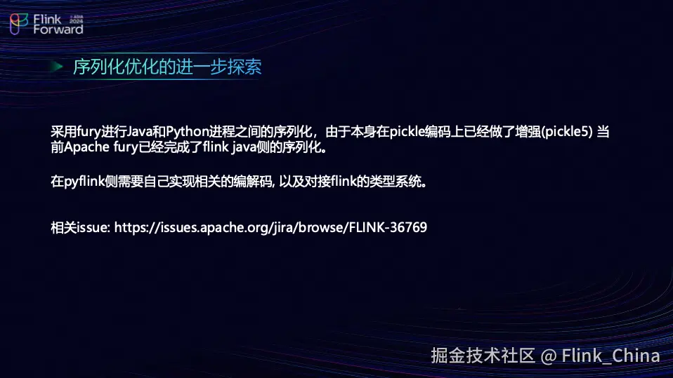通过实施流模式和 Window TVF,团队在处理 156 万数据时,性能损耗几乎降低了一半,这是团队目前研究阶段的成果。然而,团队认为这并不是最佳解决方案,因为流模式虽然有效减少了性能损耗,但可能无法满足所有业务需求和场景。因此,团队在后续的研究中考虑了其他解决方案,如 Apache Fury。Apache Fury 采用 Python 的 Pickle 编码和缓冲区的方式,基于外存进行读写优化。