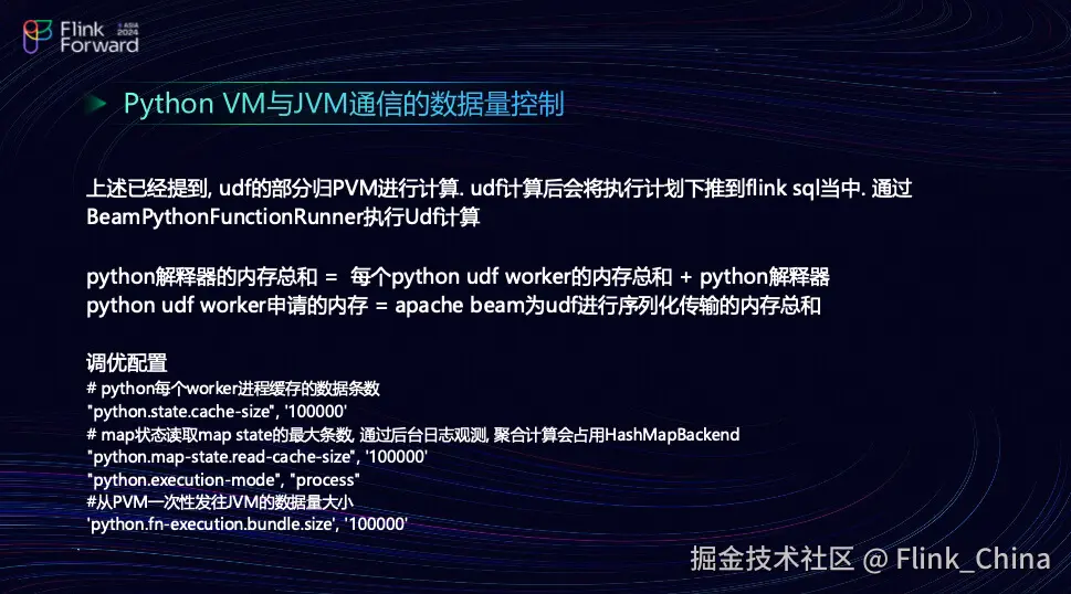 在讨论第二部分时,团队已经提到了 Python VM 和 JVM 之间通信的数据量控制问题。UDF(用户定义函数)由 Python VM 管理,而非 UDF 的部分则由 JVM 管理。这种分工有助于优化内存使用和计算效率。