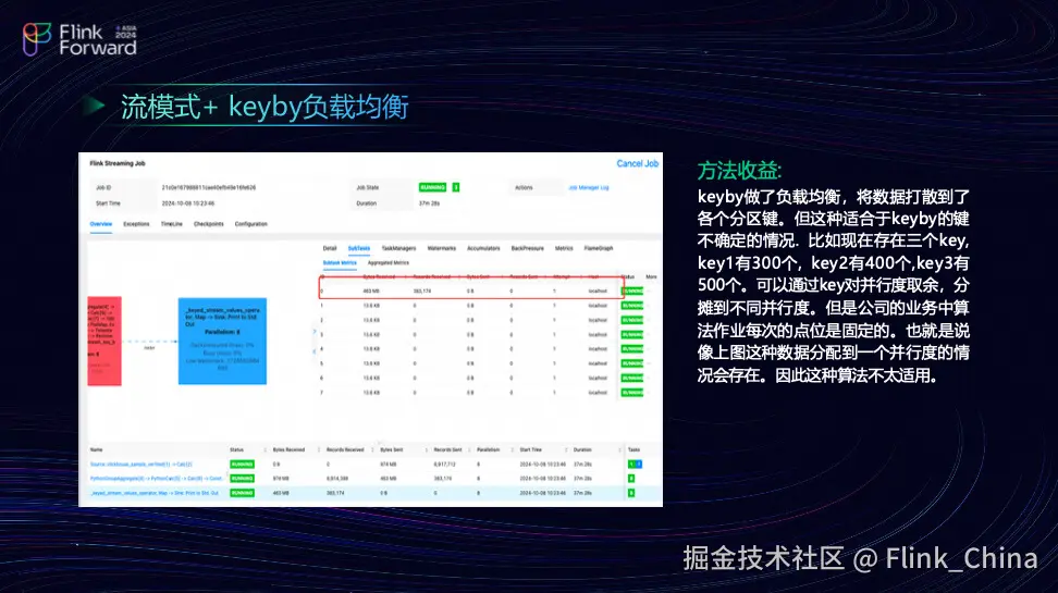 关于数据均衡化,团队在流模式下采用了 Window TVF 的方式来解决反压问题,特别是在 KeyBy 上的反压情况。虽然 KeyBy 分散策略在某些情况下是可行的,但需要根据具体场景来判断其适用性。如果 Key 是随机且不固定的,确实可以通过 Key 均衡化来处理。但如果需要满足某些业务的严格限制,则需谨慎考虑。