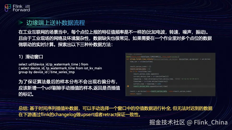 在处理边缘端数据上传时的数据补全过程中,需特别注意工业场景下设备可能出现的断流现象。这种断流通常是由于设备关机或损坏,导致无法上报特征值,从而影响 Flink 的水位线推进并导致反压问题。如果多个点位运行同一作业,解决方案需考虑现场网络环境的复杂性。团队研究了一种数据补全方法,首先利用 Flink 的依赖机制提供的时间序列差值方法。该方法能够在指定时间序列差值后,根据时间段剔除异常数据。具体来说,团队首先开启一个滑动窗口,先将这批数据暂存起来,然后使用差值方法处理时间序列数据,并在后续算子中用自定义的 UDF(用户定义函数)替换原有数据。