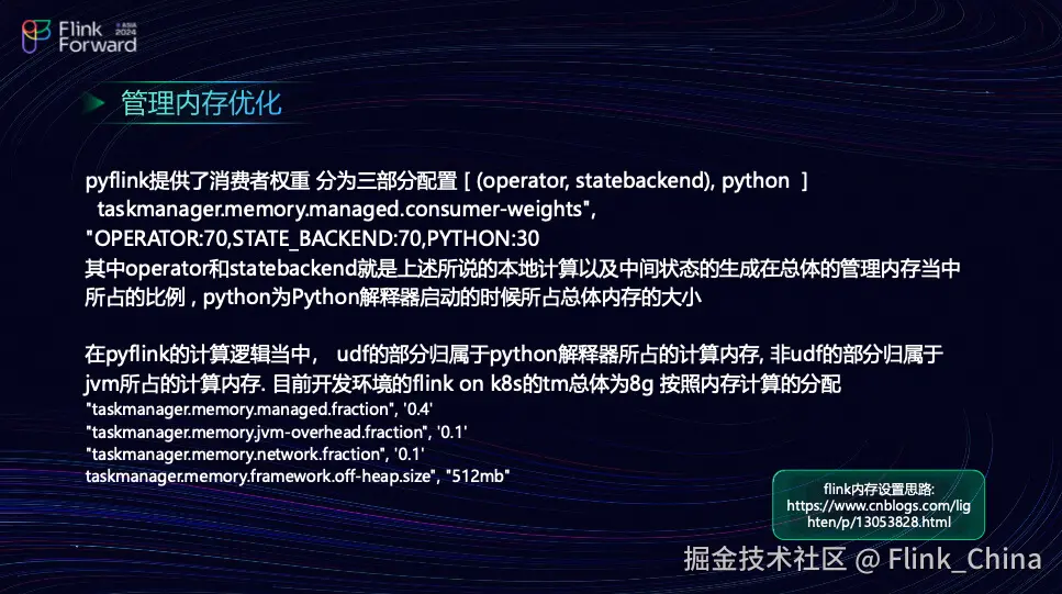 这种内存管理策略帮助团队优化资源使用,确保在执行复杂计算时的稳定性和性能。通过调整消费者权重,团队能够更好地控制 Python 和 JVM 的内存使用,提升系统效率。这个方法适用于 Flink 1.13 前后的版本,是一个经过实践验证的内存计算经验值。