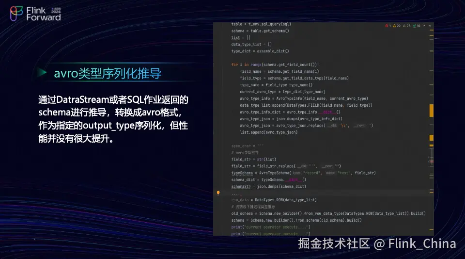 如果团队有一个包含 A、B、C 三个算子的工作流,而从 A 到 B 算子的输出 Schema 不一致,团队就需要进行类型推导。这是一个复杂的过程,团队发现它并不能完全解决问题。选择放弃 Avro 的原因在于其在 PyFlink 中的当前序列化实现仅支持从 source 到 map 再到 sink 的简单链路。如果处理链路较长,涉及到多个算子,Avro 格式可能会出现问题,比如类型冲突异常等。因此,团队在尝试后决定放弃这条路线。