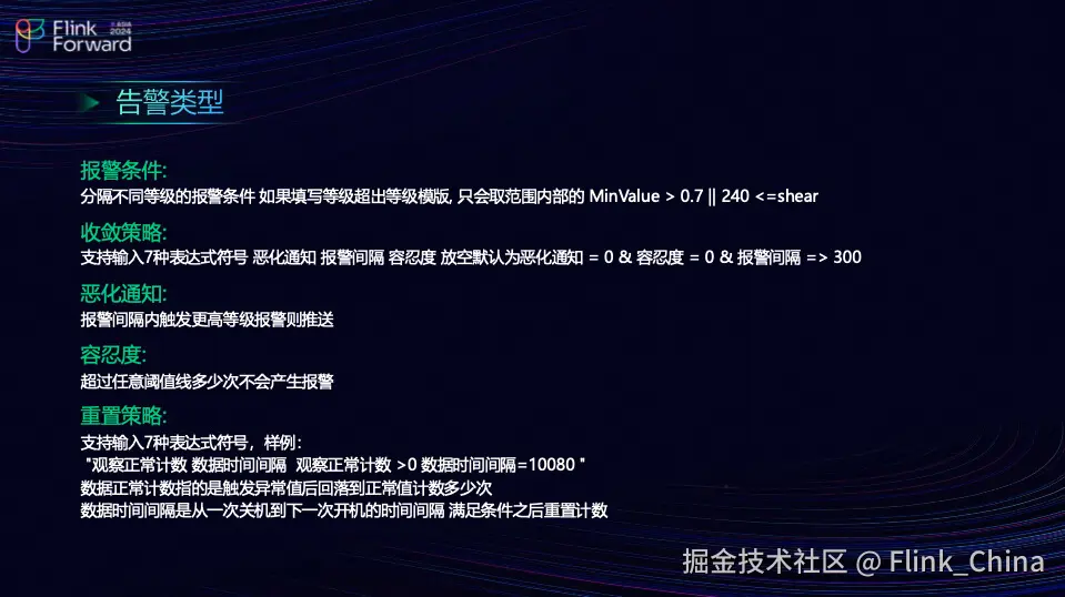 第三点,由于团队同一工作流中运行的都是同类型的点位数据,如果数据来自多个算法数据的 Topic,团队可能需要进行多流合并,这是团队告警行为次序匹配的一部分。团队的容忍度是指团队会维护一个告警基线,超过这个基线的次数达到一定阈值后,会触发一个报警。报警间隔是指超过这个报警间隔的连续次数达到一定阈值后,将不再进行告警。