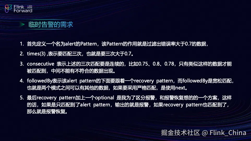 团队的告警链路分为两层:数据标定链路和临时告警链路。在规则匹配和数据标定完成后,团队可能还需要处理一些临时告警的需求。为此,团队可能需要基于 Flink 进行操作,例如过滤出错误率大于零的数据。团队可能需要使用一些 NFA (Non-deterministic Finite Automaton) 算子来实现这一点。