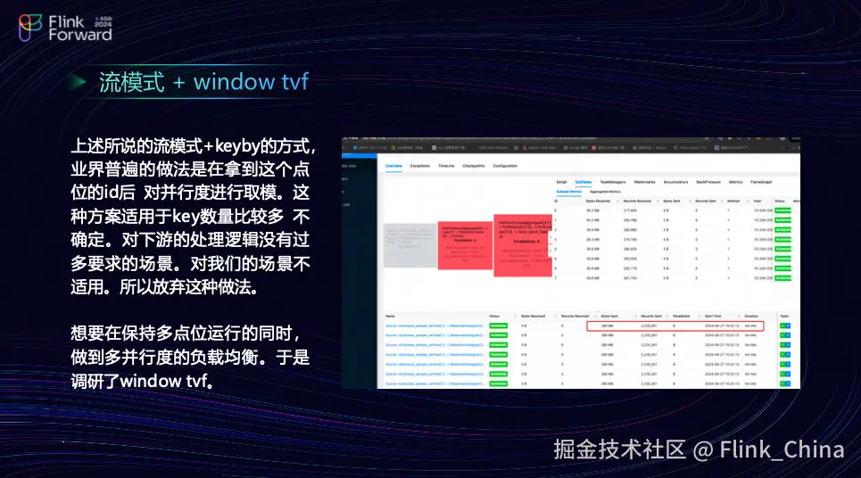 以工作流中的两个关键点为例:点位一是电流,点位二是震动。在这种情况下,系统需要调用不同的插件,因此必须根据 Id 进行分区。如果按照之前提到的 KeyBy 方法,虽然 Key 的分布可能变得均匀,但可能会破坏业务的语义,因此这种条件并不成立。团队采用了 Window TVF,并惊喜地发现每个 subtask 的数据量大约在 25 到 27 万之间,分布相对均衡。团队在使用时,将原先的表达式写成 Group By 的形式,一个表示函数,使得数据更加均衡。