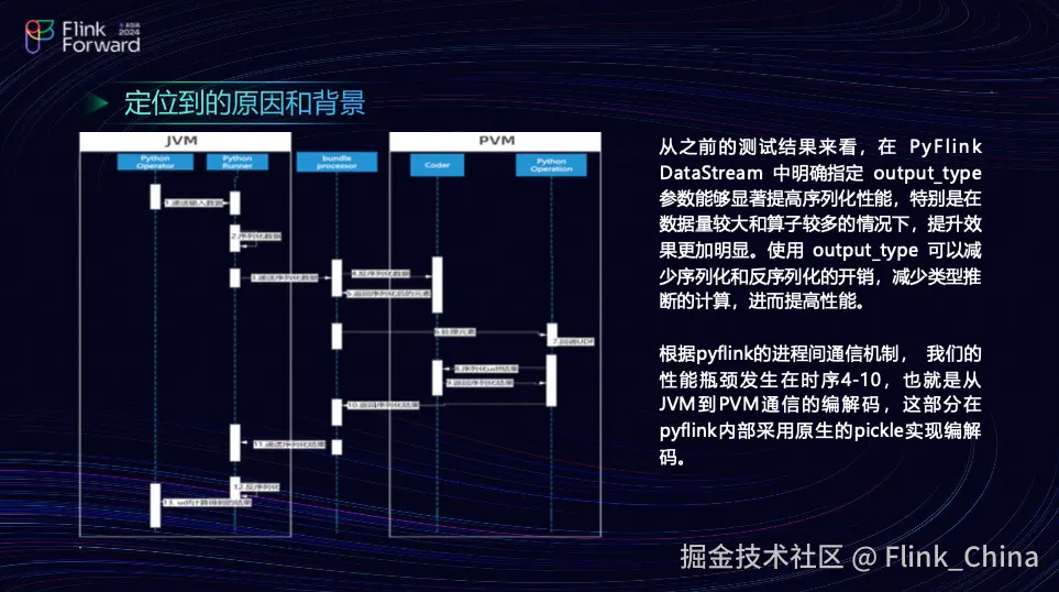 团队一旦发现问题,就需要定位问题所在。PyFlink 是一个典型的跨进程通信场景。在 PyFlink 中,每写一个 Python 作业,虽然看起来像是配置算子,但实际上是在 JVM 里面运行的。在配置算子时,JVM 会将输入数据递送到配置的一个 Runner,其他执行器会去序列化数据,通过递送序列化数据,经过一个叫做 Bundle Processor 的地方。