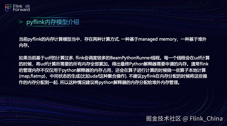 Flink 的内存模型主要有两种方式:基于 Managed Memory 管理内存和基于堆外内存。在处理大量基于 UDF 的计算时,Flink 会调度较多的 BeamPythonRunner 线程。每个线程在执行 UDF 计算时,会累加所有需要的内存,得出最终 Python 解释器需要申请的内存。