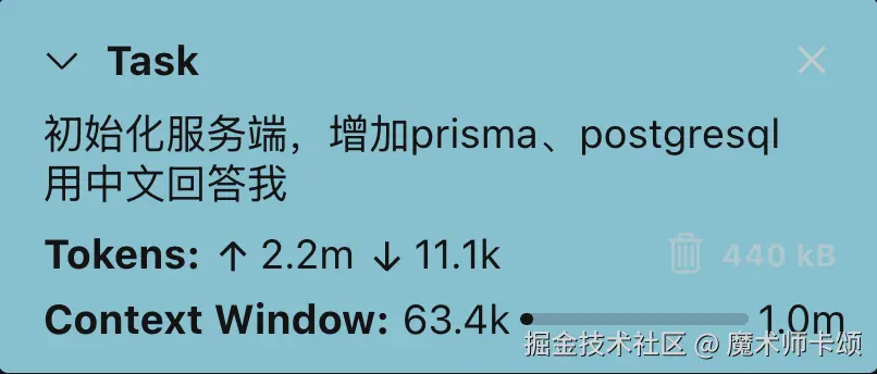比如下图,执行任务初始化服务端,增加prisma、postgresql 用中文回答我,已经消耗2.2m token,占用 63.4k上下文。