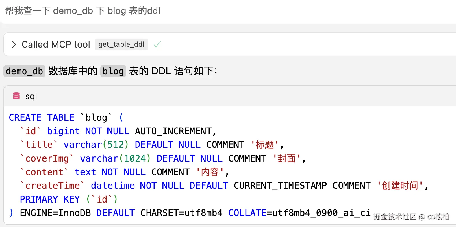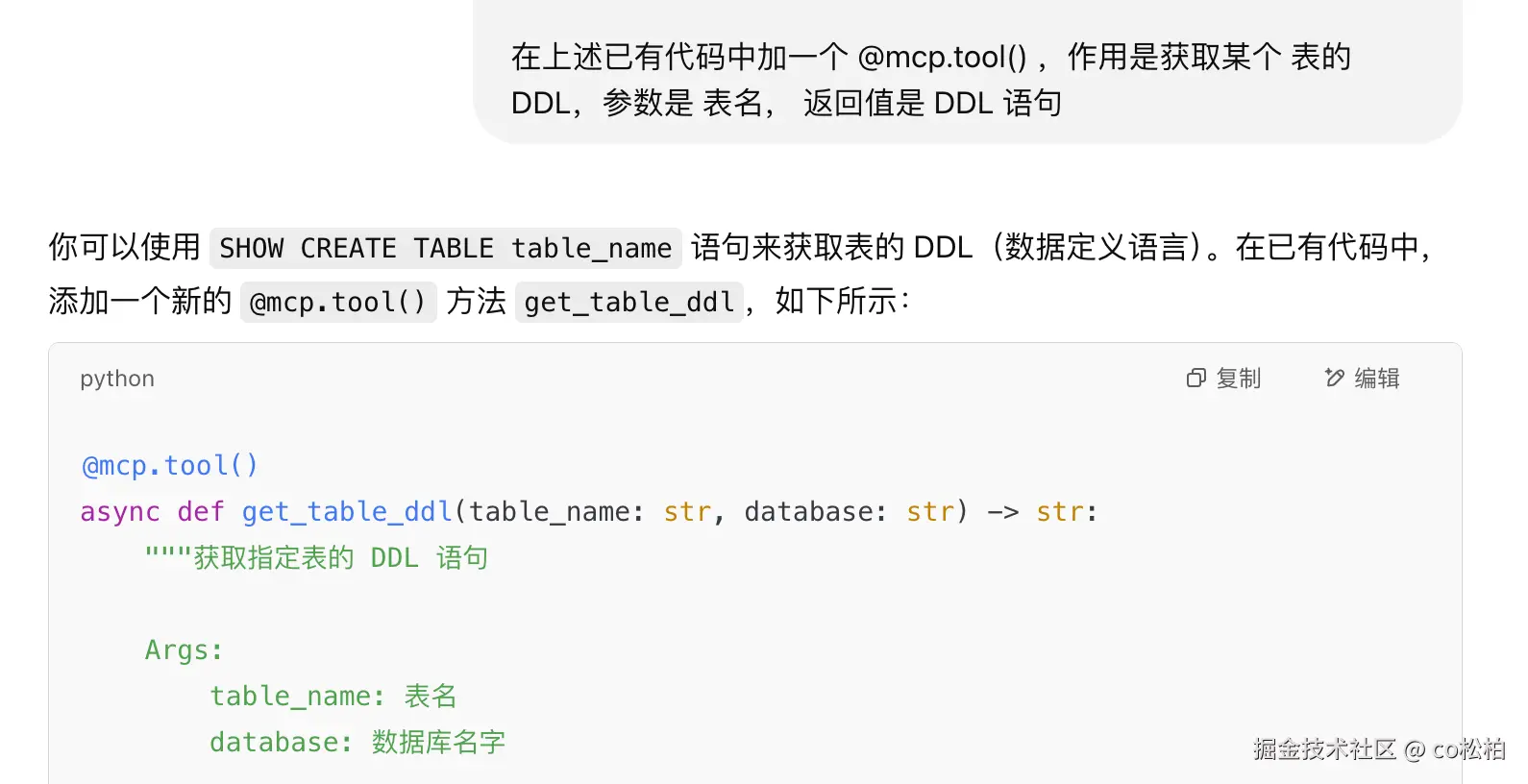3)稍微改了下上面的代码之后,我又让 GPT 给我加了一个获取某表 DDL 的功能,这样就更省事一点,使用的时候就不用我告诉它了:
