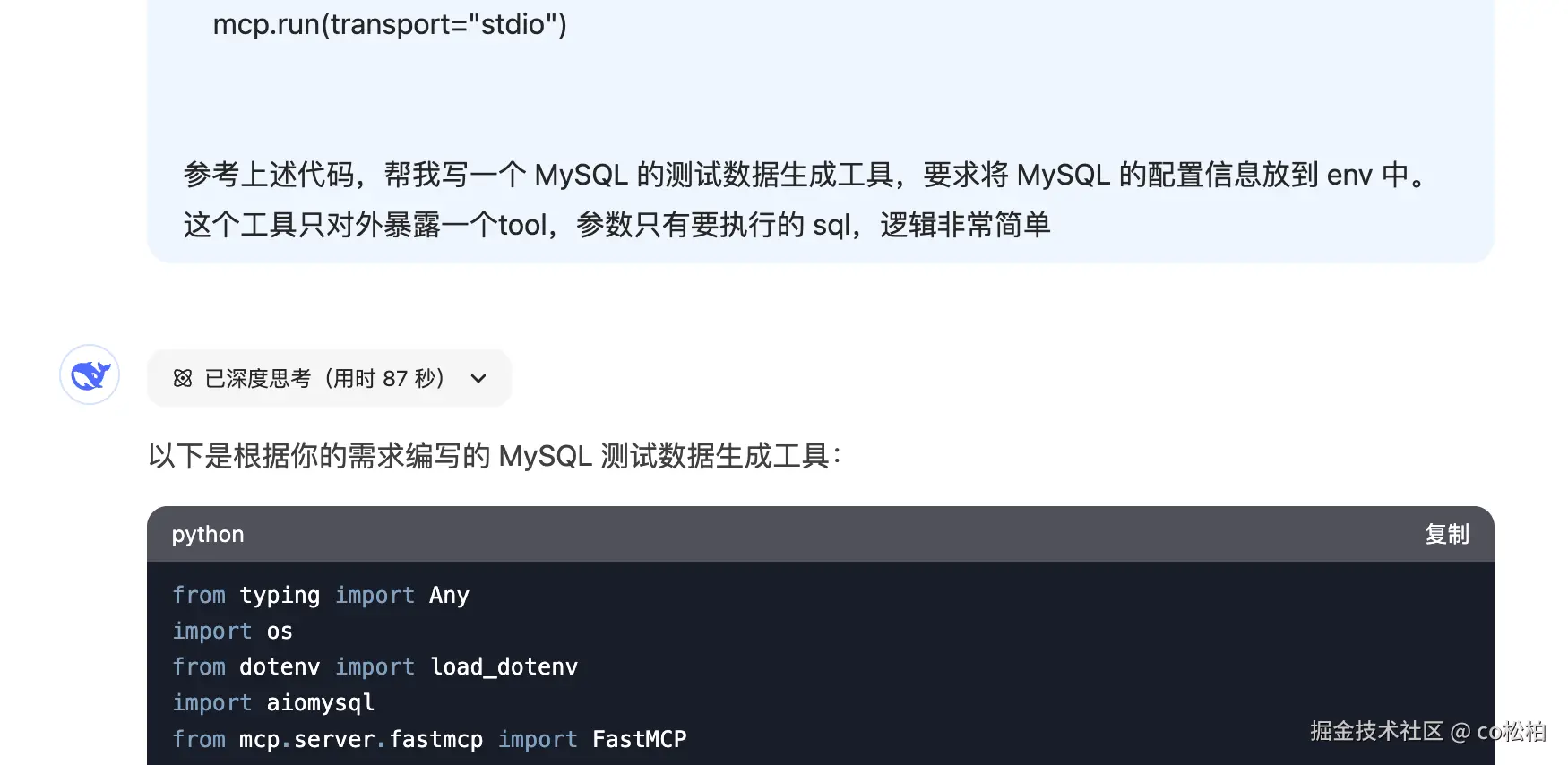 根据这个 demo ,我们自己也搓一个出来玩玩。平时开发的时候,免不了要造一些测试数据到数据库,以前都是告诉 AI DDL,让它生成对应的 insert 语句,然后手动 copy 到控制台执行。现在我们把这个过程全部交给 AI 来做,甚至把实现这个过程的代码也可以让 AI 来写!