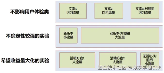 如果上线一个功能,直接流量开到50%去做测试,那么如果数据效果不好,或者功能意外出现bug,对线上用户将会造成极大的影响。所以,建议一开始从最小样本量开始实验,然后再逐渐扩大用户群体及实验样本量。
