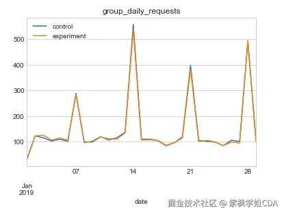 - 结果解读:排除干扰因素,比如节假日影响,综合业务价值判断是否全量。实验组daily requests与控制组不存在差异,查找原因并迭代新实验。