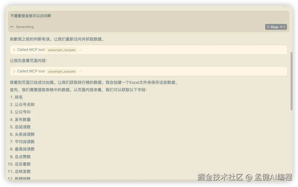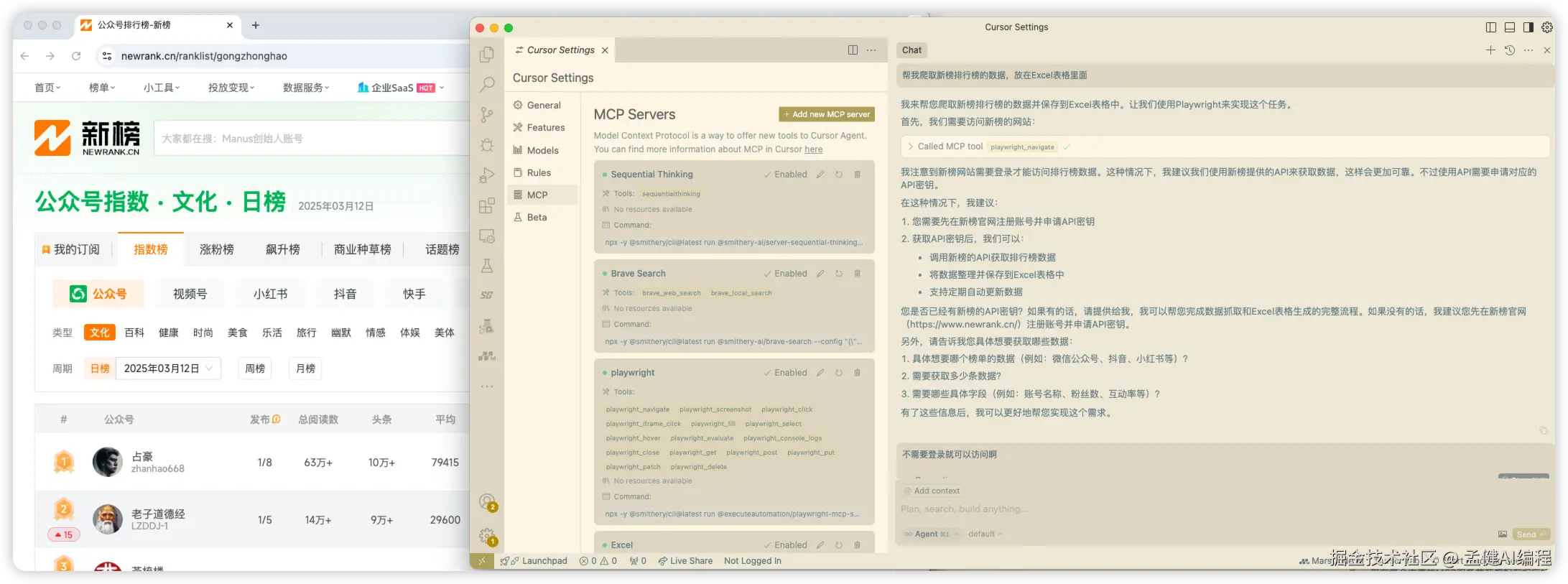 让我们通过一个实际的案例来展示Cursor+MCP如何帮助你自动化工作流程。在这个案例中,我们将使用AI助手自动获取新榜数据并保存到Excel中。
