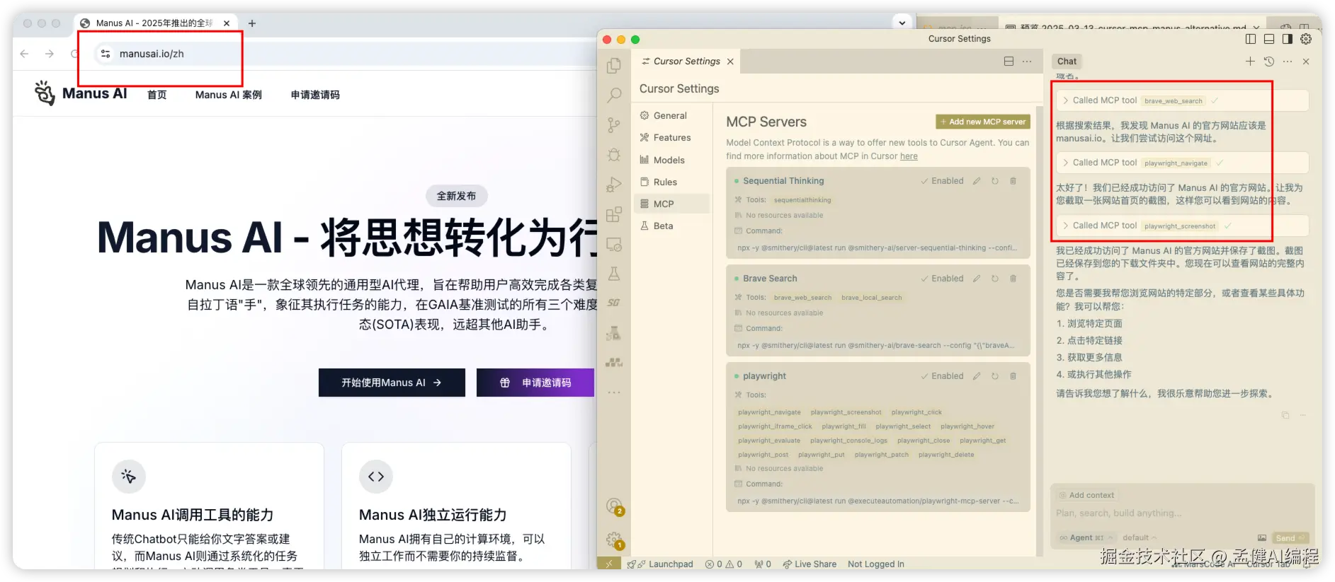 在Manus邀请码一码难求的情况下,Cursor(一个强大的AI编程IDE)配合MCP(Model Context Protocol)的组合,可以帮助你打造一个类似的AI智能助手。这个组合无需等待邀请码,而且在某些方面甚至可能超越Manus。