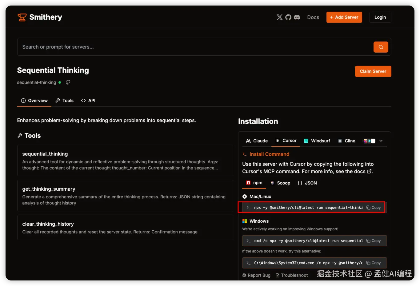 访问smithery.ai网站,找到并复制MCP服务器的配置命令: