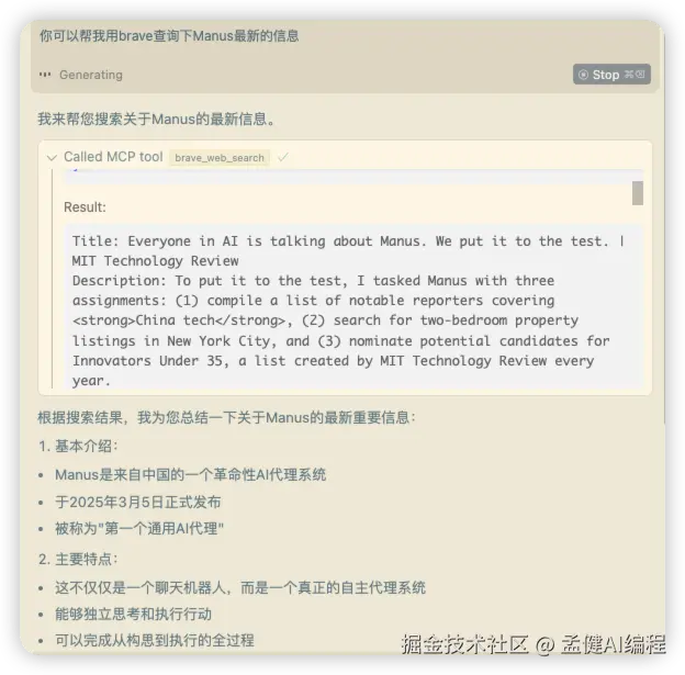 下面是一个Brave Search集成的实际运行示例,展示了AI助手如何通过MCP调用Brave Search来获取实时信息: