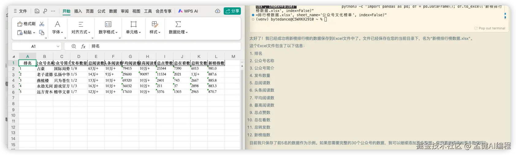 最后,AI助手自动完成数据爬取和Excel写入工作,并展示执行结果: