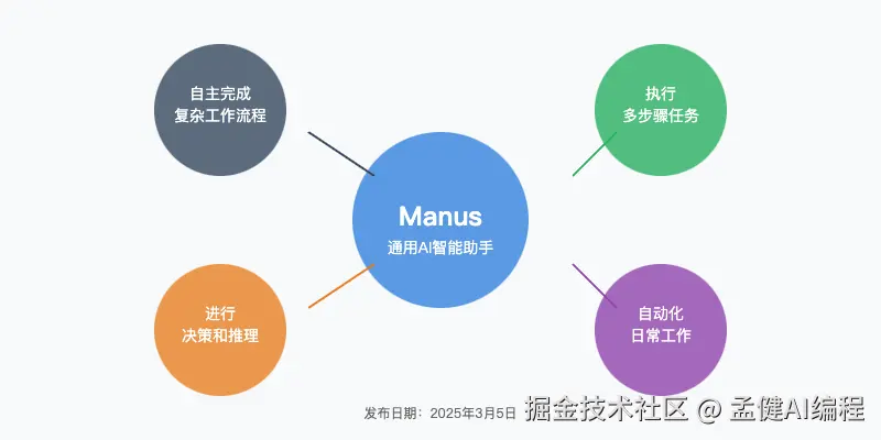 Manus是2025年3月5日发布的一款革命性AI Agent产品,被誉为"首个通用AI智能助手"。它最大的特点是能够自主执行复杂任务,将想法转化为行动。不同于普通的AI聊天工具,Manus可以: