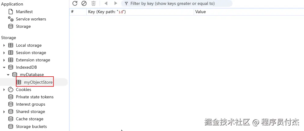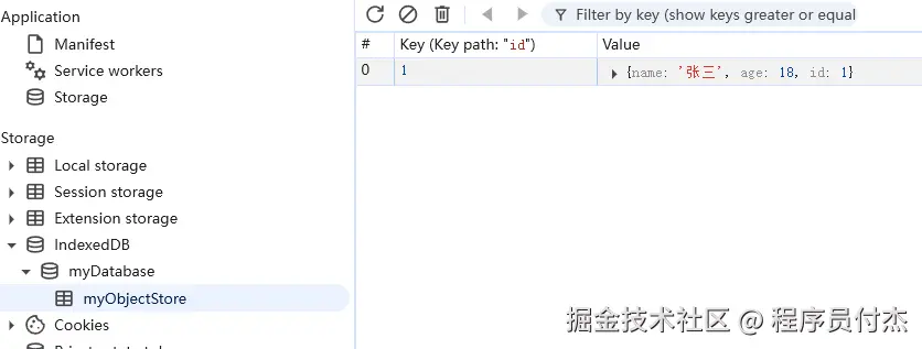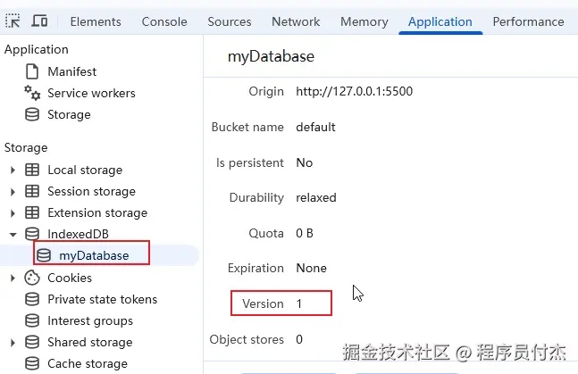在我们成功创建数据库后,可以通过浏览器的开发者工具中 Application 面板直观地看到数据库的名称以及当前版本号