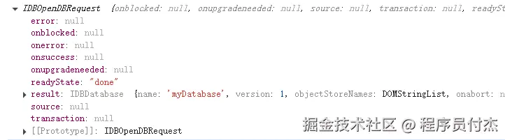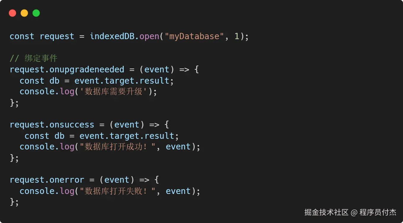 open() 方法会返回一个 IDBOpenDBRequest 对象,这是因为 IndexedDB 中的所有操作(包括打开、读取、编辑和删除) ,都是异步执行的。由于这些操作可能需要一定的时间才能完成,无法立即返回结果,因此 IDBOpenDBRequest 对象提供了一系列事件绑定机制,方便我们在操作的不同阶段(如成功、失败或数据库需要升级时)进行相应的处理。通过监听这些事件,开发者可以更灵活地控制数据库操作的流程和响应。
