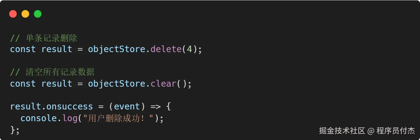 在操作数据之前,咱们得先通过事务调用 objectStore 方法,拿到要操作的存储对象。这个方法会返回一个 IDBDatabase 类型的存储对象实例。有了这个实例,咱们就可以调用它的各种方法来操作数据了。