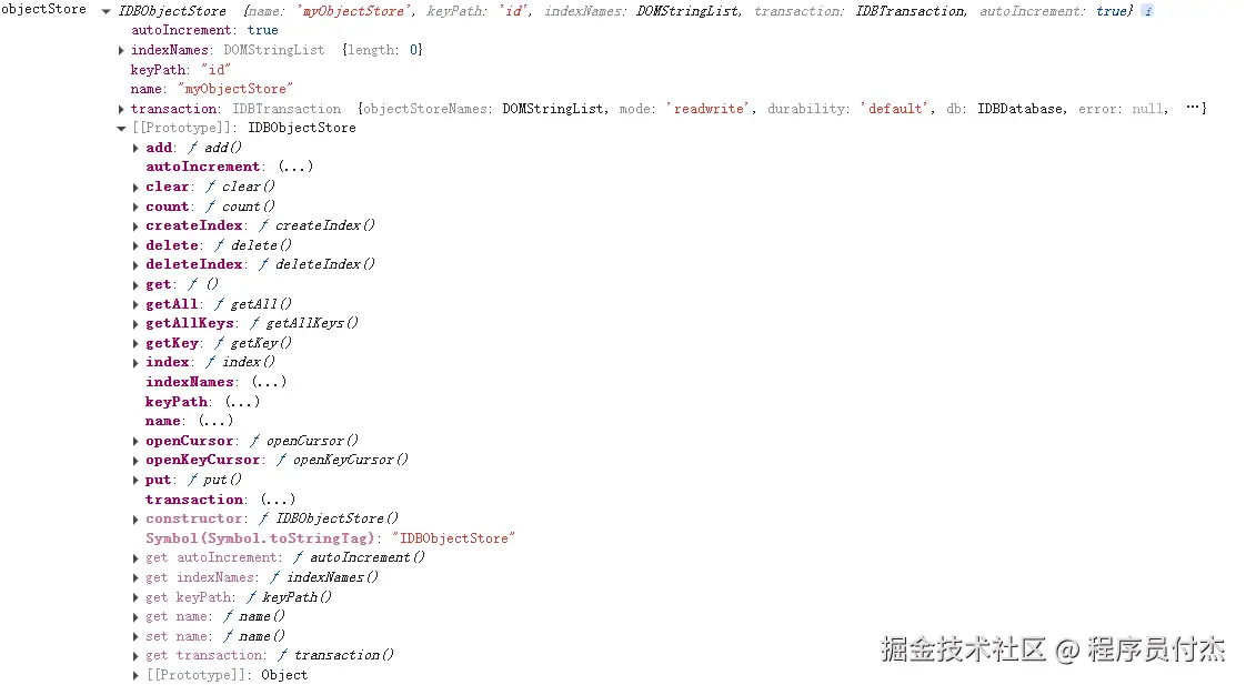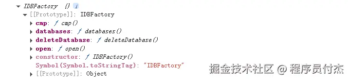 通过在控制台中输出 indexDB 对象,我们可以一目了然地看到它所提供的各种方法。