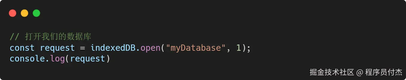 首先要掌握的就是它的核心方法之一 的open()。open() 方法用于打开或创建一个数据库,并返回一个 IDBOpenDBRequest 对象,这个对象代表了异步操作的请求。通过IDBOpenDBRequest ,我们可以监听数据库的打开状态,并进一步执行后续操作。