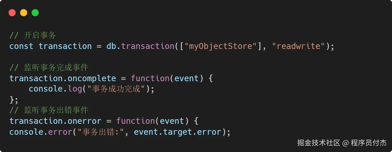 一旦事务创建成功,我们可以监听事务的 complete 和 error 事件,以处理事务完成或出错的情况。接下来,我们可以通过事务对象对指定的 myObjectStore 执行操作
