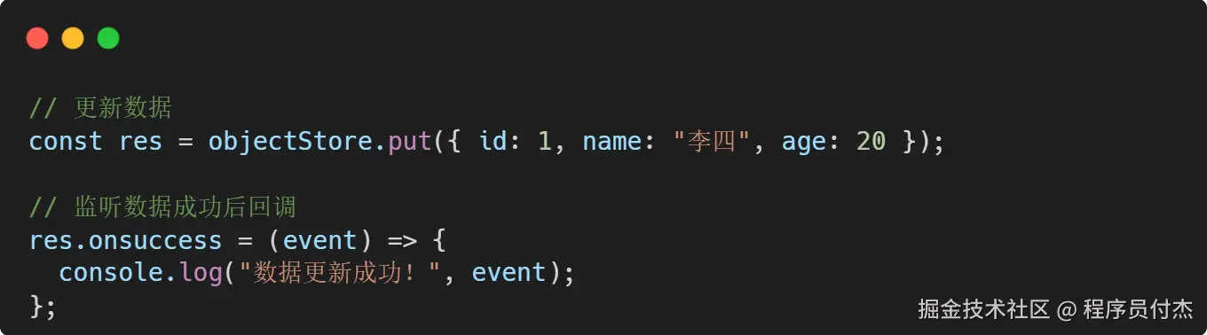 要更新数据,可以使用put()方法。使用 put 方法更新数据时,如果数据不存在则会添加。