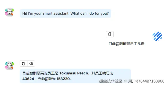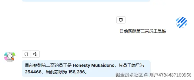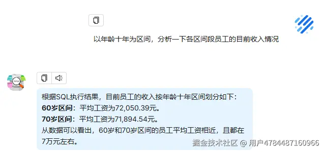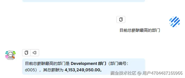 | 以部门维度,分析各部门的员工目前收入情况 | - 符合预期?sql执行结果没问题,分析估计字数超了,内网不限制token数量应该没问题 | |