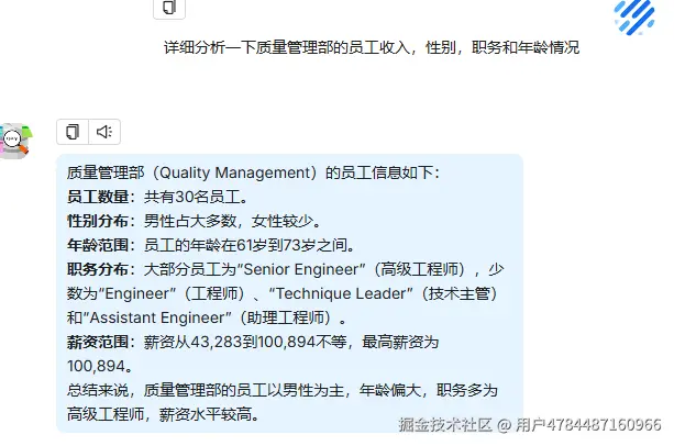 | 详细分析一下质量管理部的员工收入,性别,职务和年龄情况 | - X符合预期sql 没有问题但是由于数据量过于庞大,貌似就接收到30条数据? | |