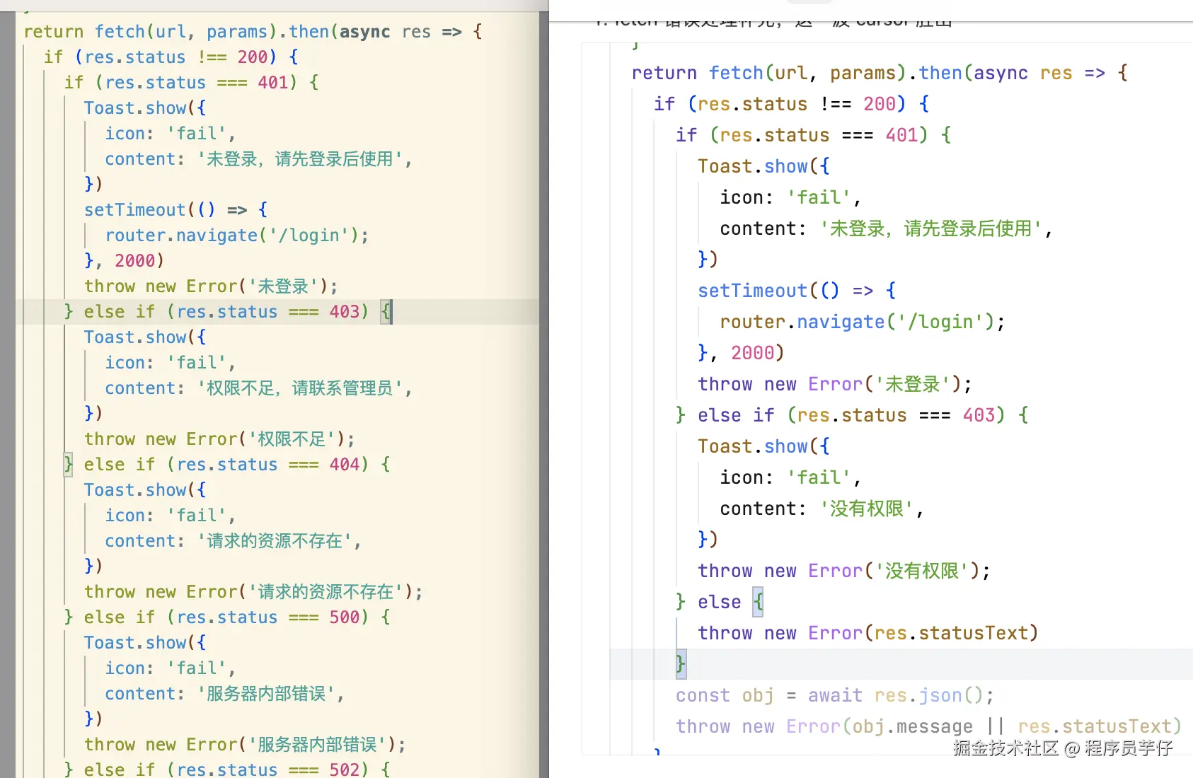 右侧是 Trae,可以看到,Trae 帮我处理了 403 之后,剩余情况直接 throw,懂 js 的都知道这里面的门道有多深:我下面的代码不会执行喽。