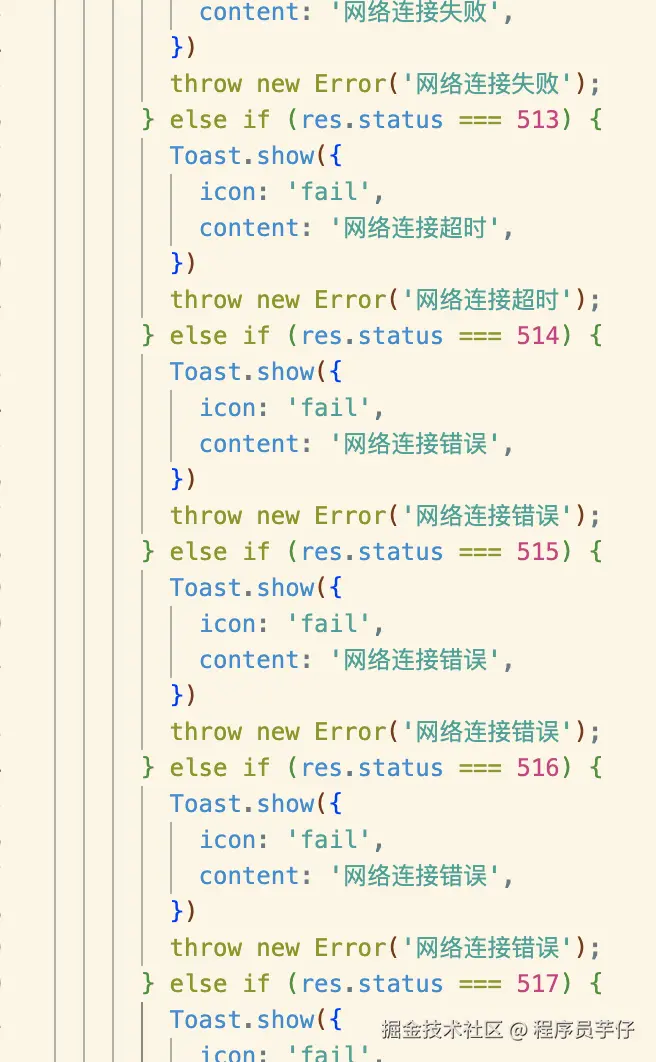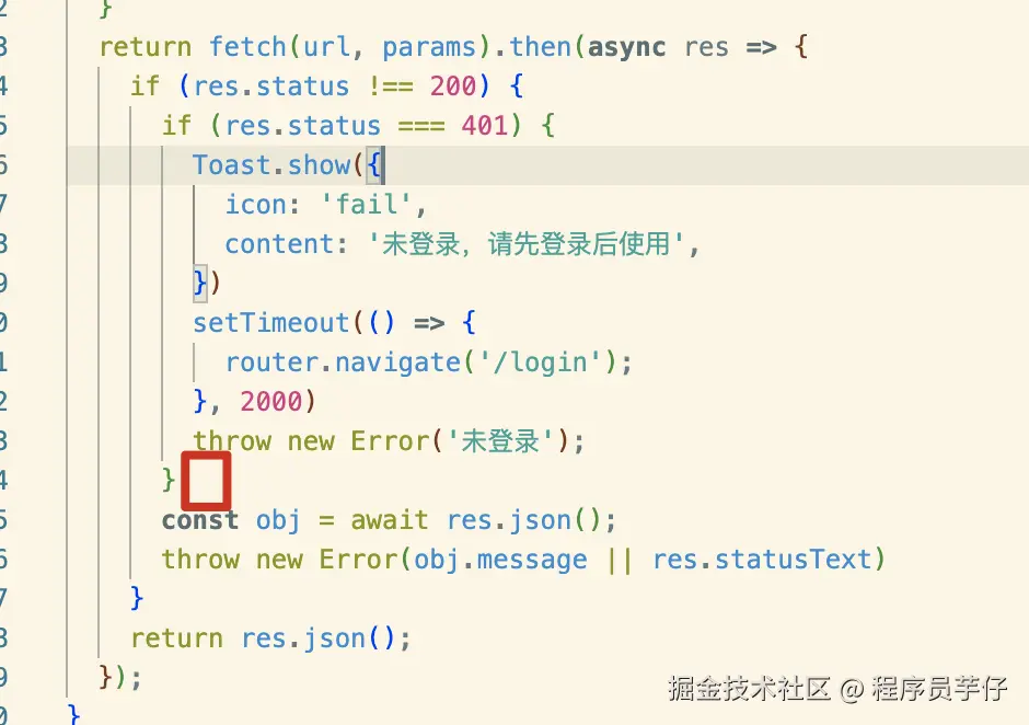 如下是我原本的代码,非常常见的 Fetch 的代码,当我把鼠标放在图示位置时,我心里想的是帮我多处理几个 code,而不仅仅是 401