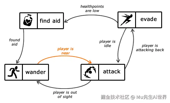 - 将NPC行为拆分为离散状态(如“巡逻”“战斗”“逃跑”),通过条件触发切换。