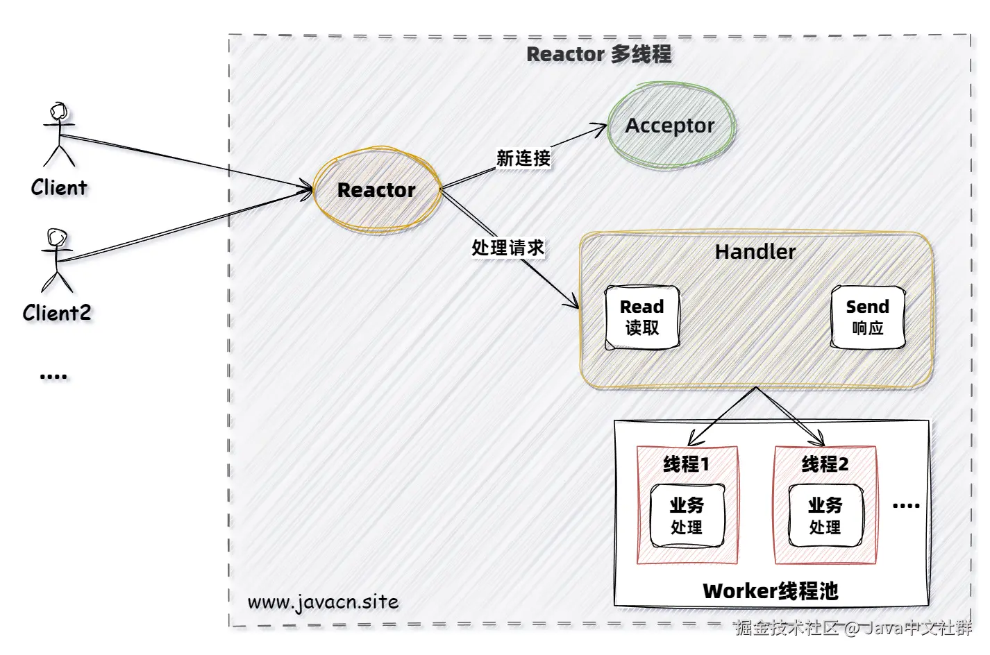 - Reactor:负责监听和分发事件,通常基于 I/O 多路复用技术,如 epoll。