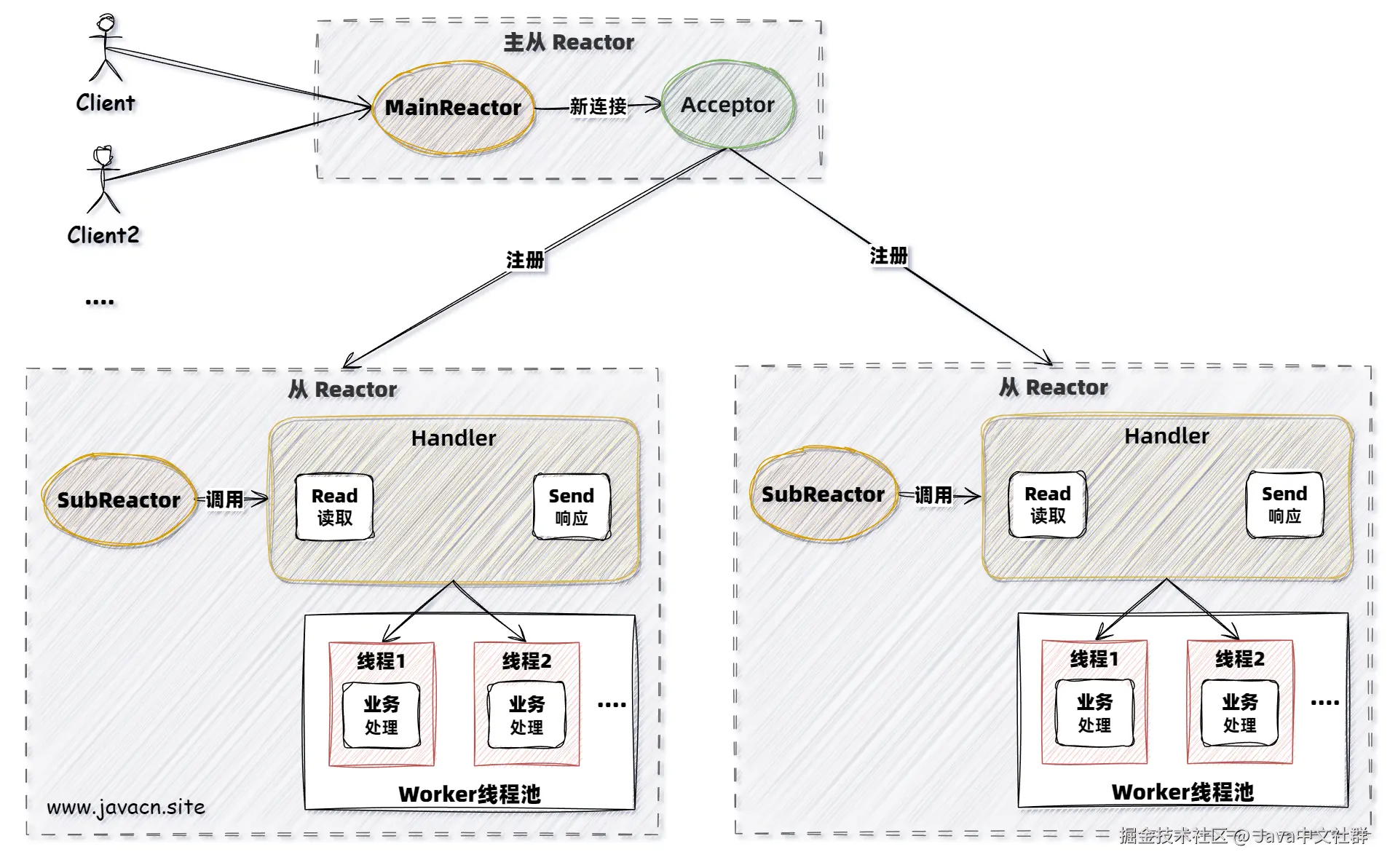 - Acceptor:负责接收新的客户端连接,并将其注册到 Reactor 中。