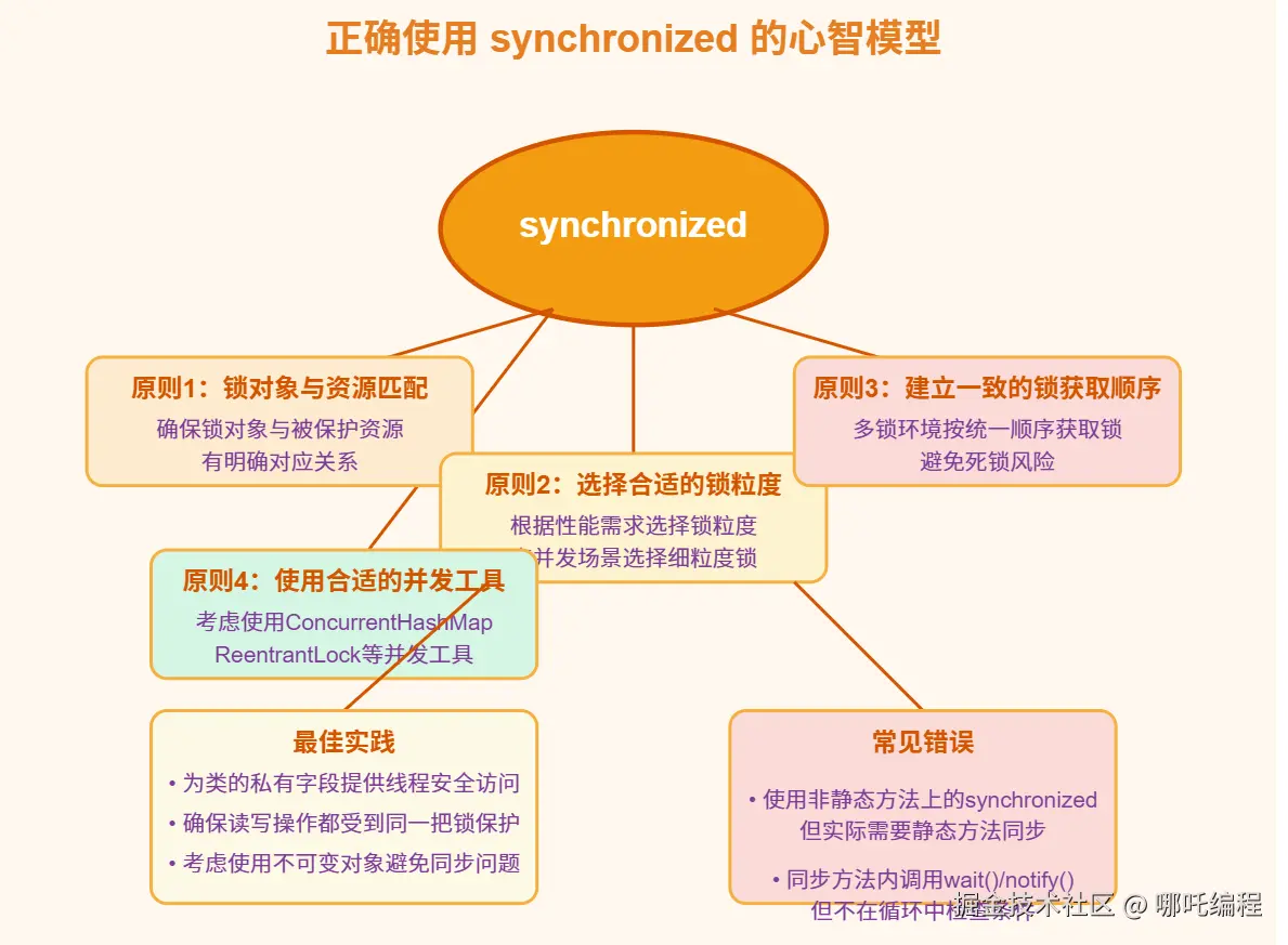 确保锁对象与被保护资源有明确的对应关系,并且在所有线程间共享同一把锁。就像一个房间只能用一把钥匙控制进入一样。
