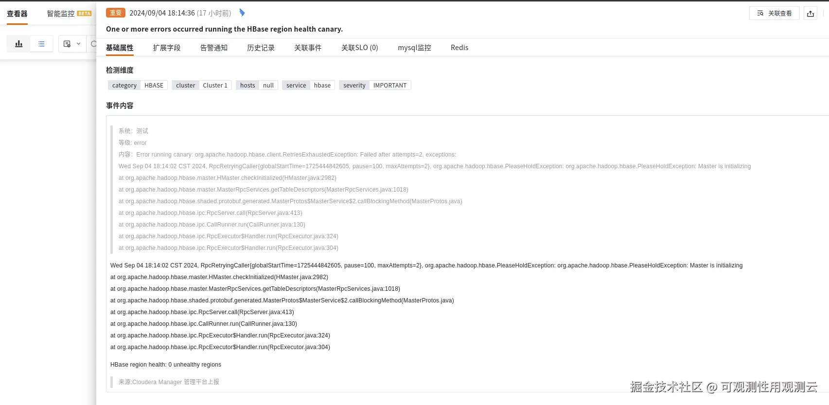 登陆观测云平台,点击事件菜单,可以看到新产生的事件信息,并通过详情可以看到具体的内容。