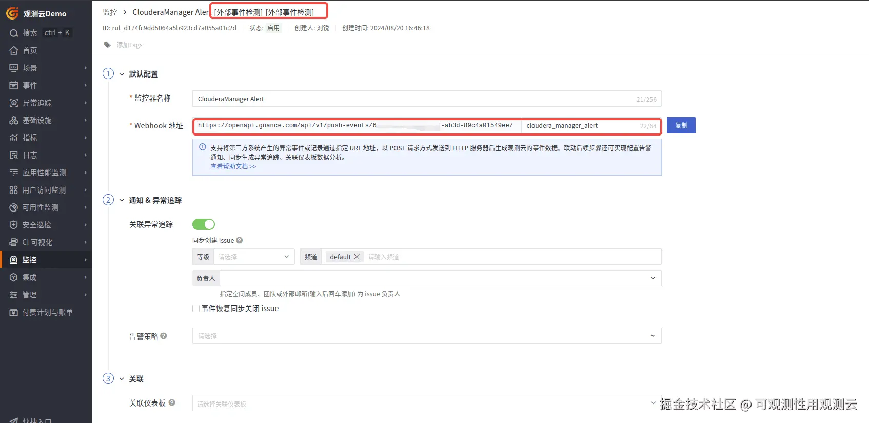 登陆观测云,选择监控 -> 新建监控器 -> 外部事件检测 ,填写基础信息,复制 webhook 地址,点击保存。