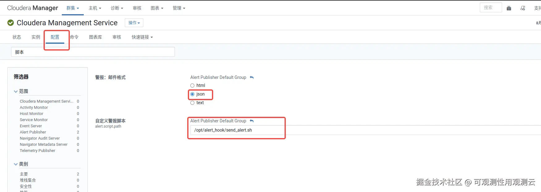 在 Alert Publisher 所在的主机上编写 send_alert.sh 脚本后,需要在 Cloudera Management Service 配置告警脚本,可以理解为这是一个 webhook,但不支持 url 的那种。