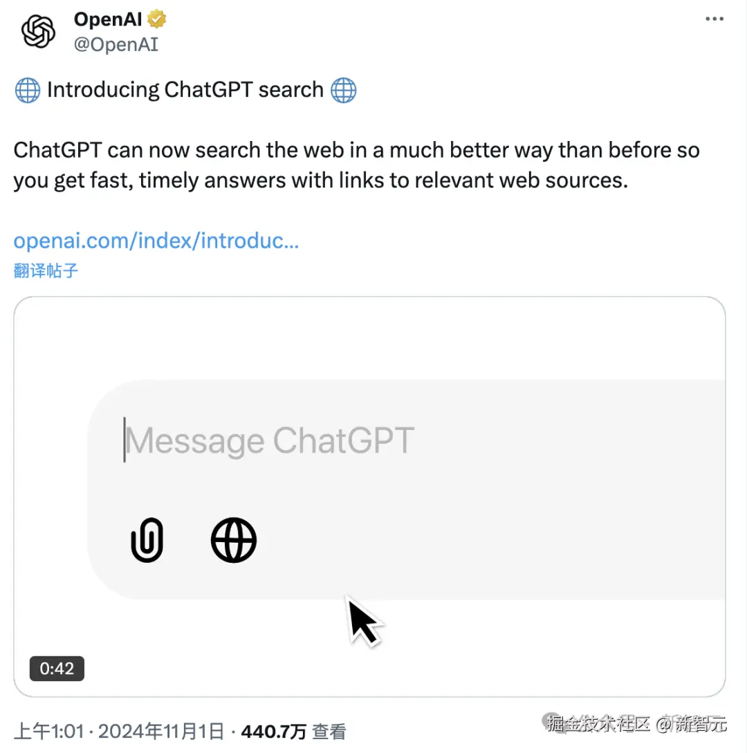 OpenAI 火速跟进「硬刚」,在 2024 年 11 月推出 ChatGPT 网络搜索功能。
