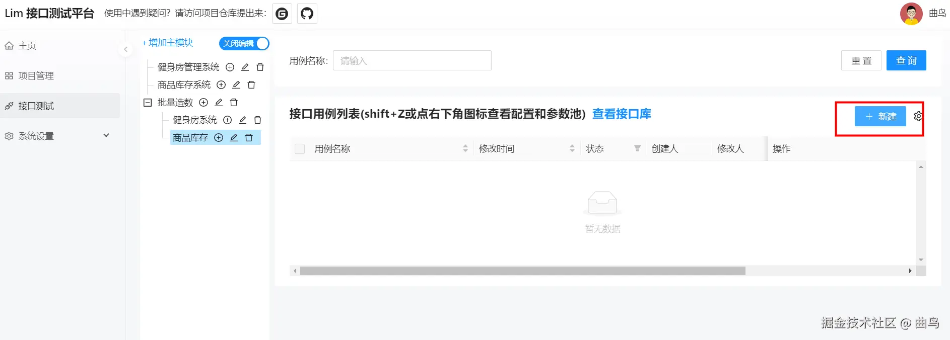 进入lim平台-接口测试模块中,然后点击右侧的新建按钮: