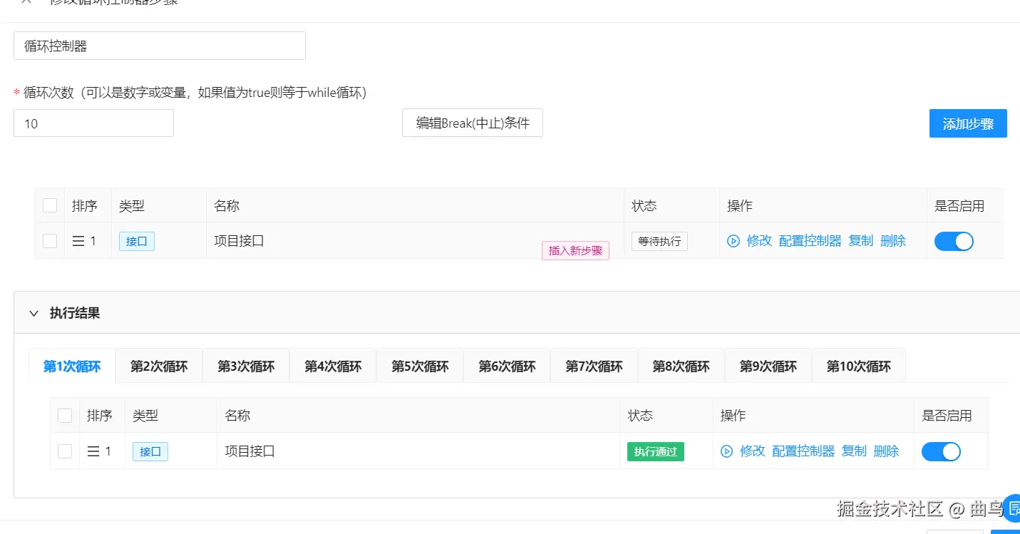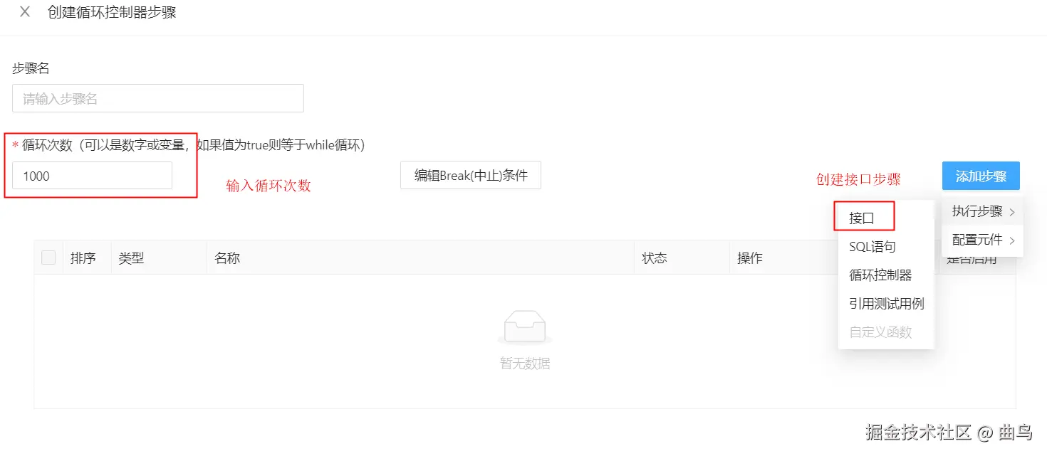 然后在循环器中输入循环次数1000,再添加一个接口步骤: