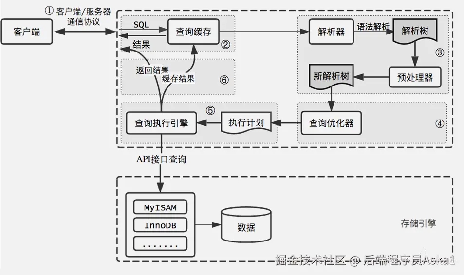 ⑤执行器来执行SQL语句,这里具体的执行会操作MySQL的存储引擎来执行 SQL 语句,根据存储引擎类型,得到查询结果。若开启了 Query Cache,则缓存,否则直接返回。