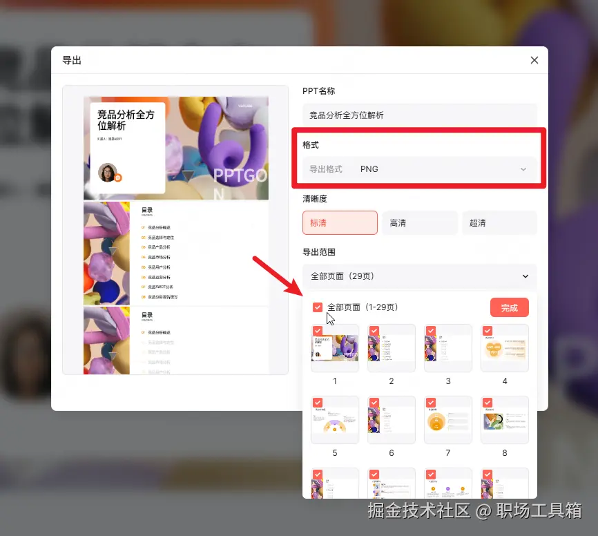 在打开的导出面板,将格式更改为PNG或JPG,点击下方“导出范围”的选项,默认导出全部页面,如果只需导出部分页面,可以取消勾选“全部页面”,在下方勾选相应的页面,之后点击右上角的“完成”保存修改,最后点击导出按钮,就能一键将PPT导出为图片。