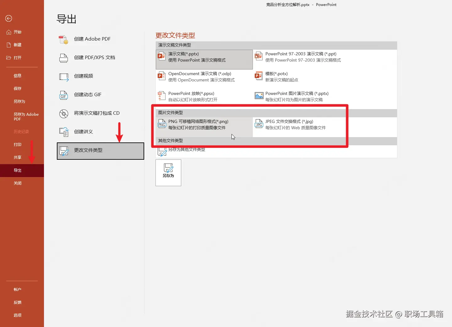 点击“导出 > 更改文件类型”,选择PNG或JPEG格式,就能将PPT导出为图片。