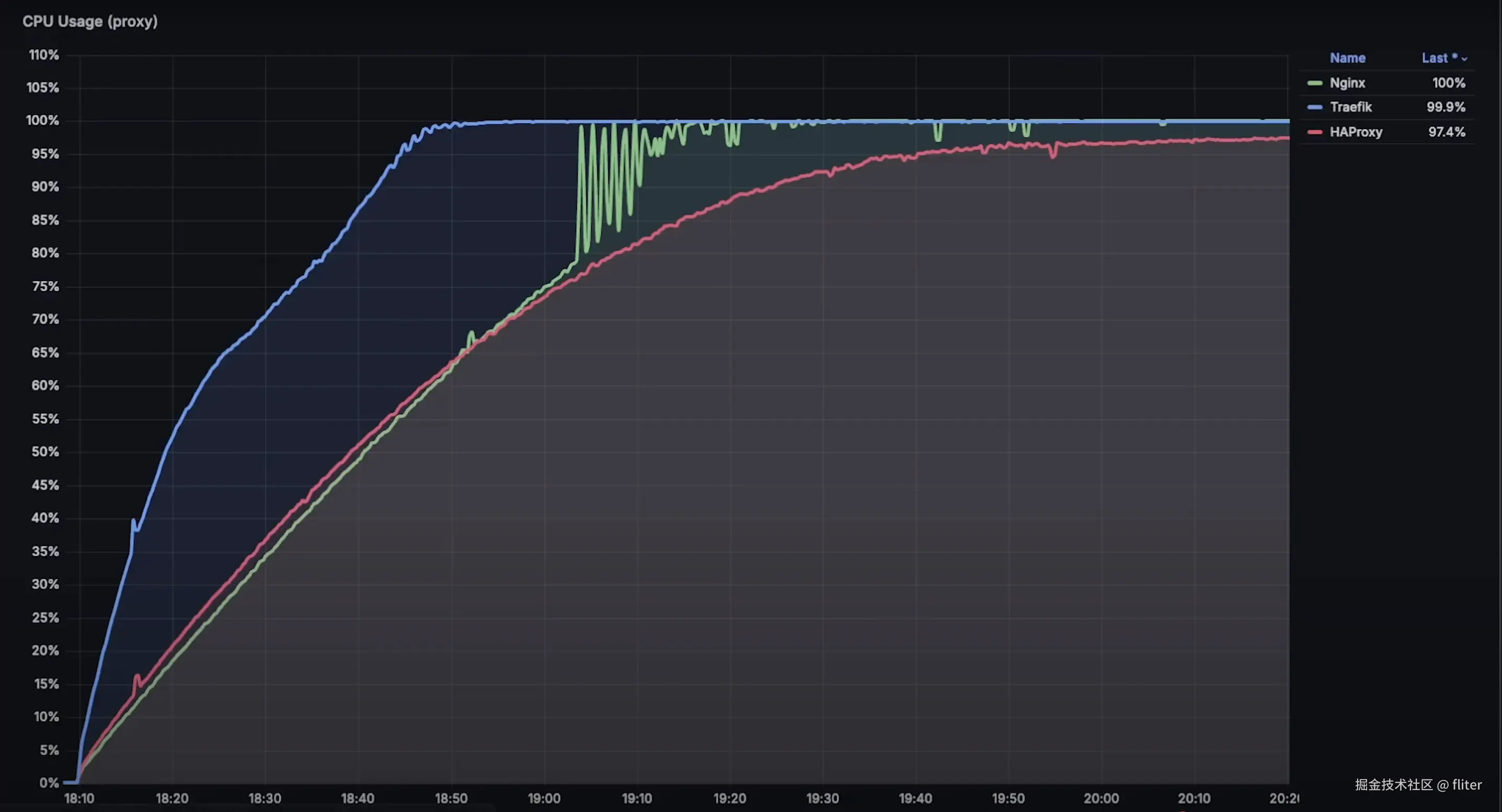 我们将从客户端测量 p90 百分位数的延迟,并评估每个代理服务器能够处理的 每秒请求数、代理服务器的 CPU 使用率、代理服务器后端应用的 CPU 使用率,以及它们的 可用性或错误率。