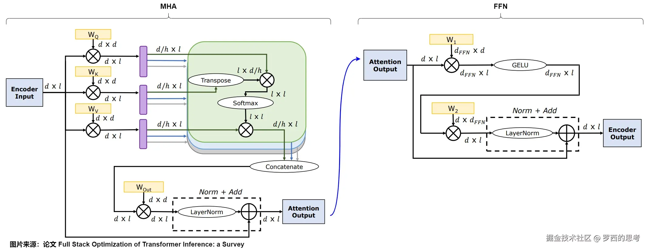Transformer模型由 l 个相同的层组成,每个层主要分为两部分:MHA和FFN。因为多头只是逻辑上切分,物理上没有增加模块,因此后续讨论中省略多头(某些论文中如果讨论多头相关,我们会以论文为准),而又因为Decoder only模型使用的是自注意力,因此接下来我们认为 Q、K、V、O的维度相等。