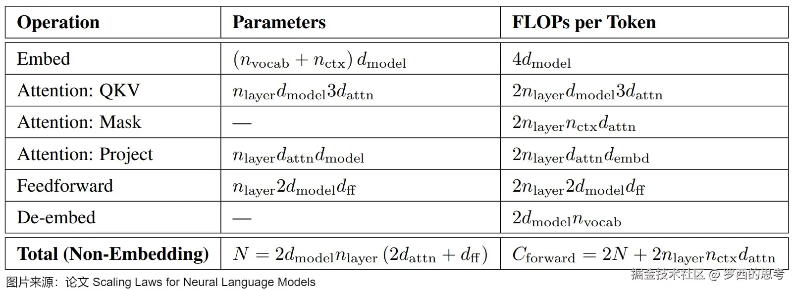 在论文"Scaling Laws for Neural Language Model"中也有类似的计算公式,具体如下图所示。