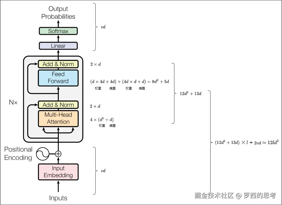 最终,l 层transformer模型的可训练模型参数量为 。当d较大时,可以忽略一次项,模型参数量近似为 。